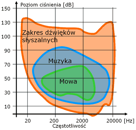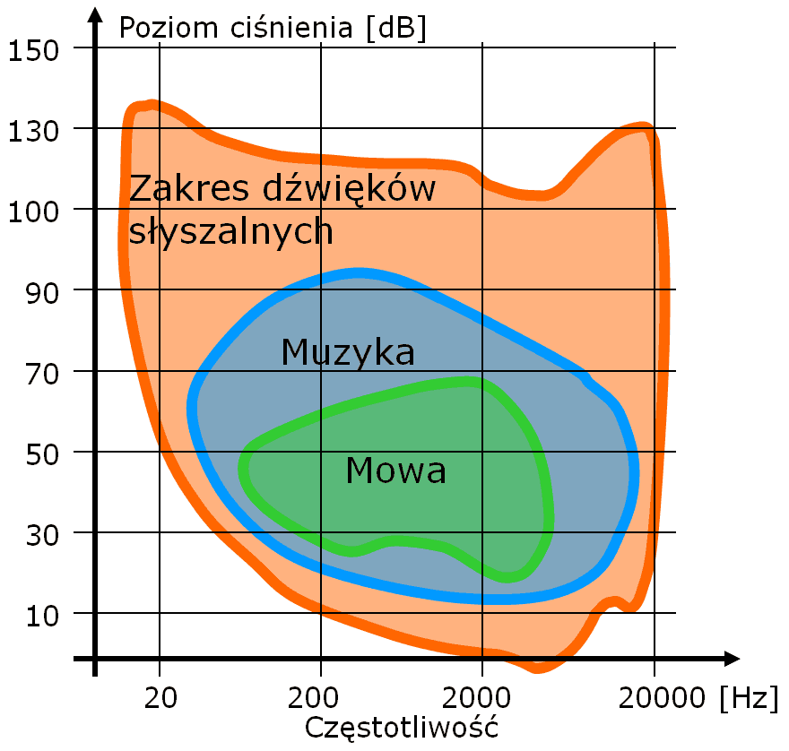 Rys. 7. Obszar dźwięków słyszalnych oraz obszary muzyki i mowy dla osoby ze słuchem prawidłowym.