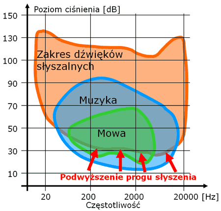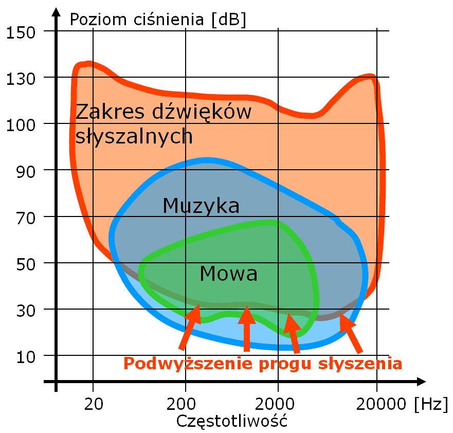 Podstawową konsekwencją przesunięcia progu słyszenia jest pogorszenie zrozumiałości mowy. Na Rys. 7 i Rys. 8 pokazano schematycznie zakres dźwięków słyszalnych oraz zakresy dźwięków odpowiadających typowemu sygnałowi muzyki i sygnałowi mowy dla słuchu prawidłowego (Rys. 7) i uszkodzonego (Rys. 8). Przesunięcie progu słyszenia (Rys. 8) powoduje, że część sygnału mowy (w zakresie wyższych częstotliwości), mająca decydujący wpływ na zrozumiałość mowy znajduje się poza obszarem dźwięków słyszalnych.