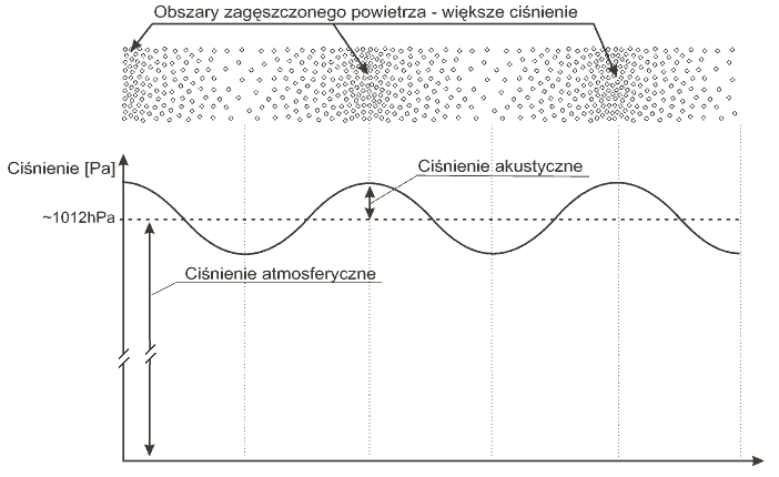Zagęszczenia i rozrzedzenia cząstek powietrza będące wynikiem propagowania się dźwięku wywołują niewielkie zmiany ciśnienia w tych obszarach powietrza. W miejscach, w których cząsteczki powietrza są zagęszczone (Rys. 3), ciśnienie powietrza jest nieco wyższe niż ciśnienie atmosferyczne, natomiast w miejscach gdzie są one rozrzedzone ciśnienie jest niższe niż atmosferyczne. Te niewielkie zmiany ciśnienie nazywamy ciśnieniem akustycznym oznaczanym symbolem "p". Jednostką miary ciśnienia akustycznego jest Pascal [Pa]. Im większa jest amplituda drgań źródła dźwięku i zarazem cząsteczek powietrza, tym większe jest ciśnienie akustyczne. Dźwięki o większym ciśnieniu akustycznym odbierane są przez człowieka jako głośniejsze, na przykład: szept - 0,0003 Pa, odkurzacz - 0,05 Pa, młot pneumatyczny - 10 Pa