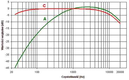 Ucho ludzkie reaguje w różny sposób na dźwięki o różnych częstotliwościach. Przy niskich poziomach dźwięku najlepiej odbieramy te o częstotliwościach od 2 do 4 kHz. Właściwości ludzkiego ucha sprawiają, że dźwięk o częstotliwości 2 kHz i poziomie ciśnienia akustycznego równym 30 dB wydaje się nam tak samo głośny jak dźwięk o częstotliwości 100 Hz i poziomie około 50 dB. Im większe są poziomy ciśnienia akustycznego dźwięków, tym te różnice wydają się mniejsze. Aby uwzględnić czułość ucha ludzkiego na dźwięki w zależności od ich częstotliwości i poziomu ciśnienia akustycznego wprowadzono krzywe korekcyjne. Najczęściej stosowane - A i C pokazano na Rys. 5.