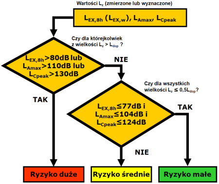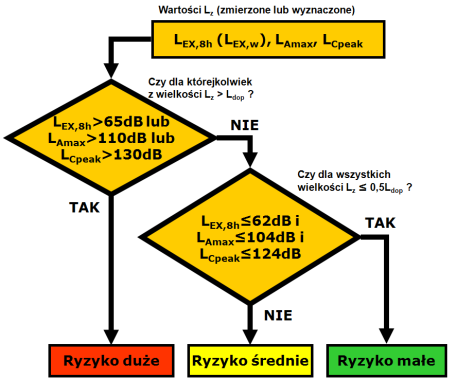Na Rys. 7, Rys. 8 i Rys. 9 przedstawiono schematycznie sposób przeprowadzania oceny ryzyka zawodowego związanego z narażeniem na hałas dla ogółu pracowników oraz pracowników młodocianych i kobiet w ciąży z uwzględnieniem wartości dopuszczalnych obowiązujących dla tych grup pracowników.