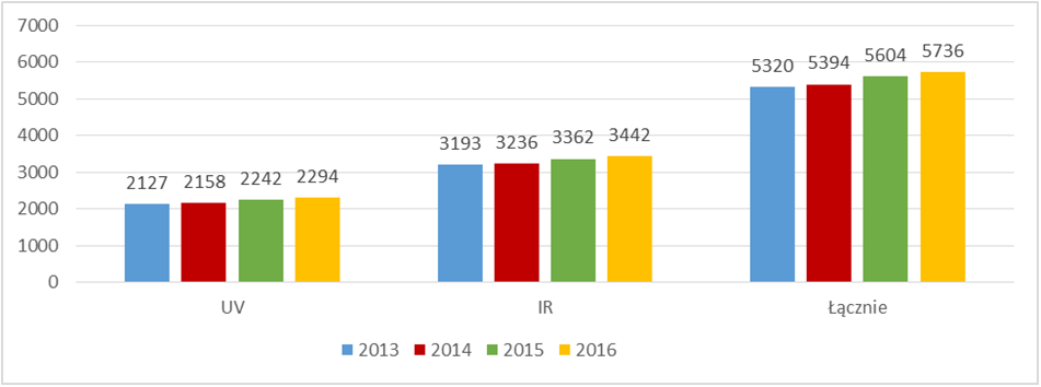 Do roku 2008 coroczne dane GUS o warunkach pracy przedstawiały osobno liczbę zatrudnionych w warunkach zagrożenia (tzn. stwierdzone zostały przekroczenia wartości maksymalnych dopuszczalnych ekspozycji) dla sztucznego promieniowania podczerwonego (IR) i nadfioletowego (UV), natomiast od roku 2009 podawane są tylko dane zbiorcze dla „promieniowania”, które obejmują sumę pracowników zagrożonych napromieniowanie jonizujące, laserowe, nadfioletowe i podczerwone. W 2019 r. w zagrożeniu promieniowaniem pracowało ogółem 8218 osób. Statystyki te nie obejmowały i nie obejmują ekspozycji na promieniowanie widzialne, które może również stanowić o szkodliwości dla zdrowia. Stąd dane te były i są niedoszacowane, a od 2009 r. liczba osób pracujących w zagrożeniu na UV i IR może być tylko określana szacunkowo, na podstawie danych o zatrudnieniu w warunkach zagrożenia na 1000 zatrudnionych w badanej zbiorowości. Zgodnie ze statystykami GUS w latach 2013 – 2016 w warunkach zagrożenia na promieniowanie nadfioletowe pracowało 0,4 osoby na 1000 zatrudnionych objętych badaniem, a w zagrożeniu na promieniowanie podczerwone – 0,6 osoby na 1000 zatrudnionych. Prze ostatnie 4 lata ww. wartości nie uległy zmianie. Przyjmując rzeczywiste dane o liczbie zatrudnionych objętych badaniami w poszczególnych latach wyznaczone szacunkowo liczby osób zatrudnionych w warunkach zagrożenia na promieniowanie nadfioletowe i podczerwone oraz łącznie na te dwa zakresy promieniowania przedstawiono na rys. 1.
