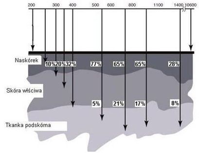 W zależności od długości fali promieniowanie optyczne wnika do tkanki skóry na różną głębokość i jest absorbowane w różnych jej częściach. Po wniknięciu promieniowania do tkanki jest ono w niej absorbowane i rozpraszane, a część jest także transmitowana do głębszych partii, w zależności od współczynnika absorpcji zmienia się wartość głębokości wnikania promieniowania. Głębokość wnikania promieniowania w obszar skóry zależy od współczynnika absorpcji tkanek, im współczynnik absorpcji wyższy tym głębokość wnikania niższa. Na rys. 2 przedstawiono głębokość wnikania promieniowania w obszar skóry dla poszczególnych zakresów promieniowania optycznego. Można zauważyć , że najgłębiej wnika w skórę promieniowanie z zakresu widzialnego i bliskiej podczerwieni (IRA).