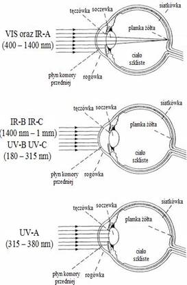 Wnikanie poszczególnych zakresów promieniowanie optycznego w gałkę oczna również silnie zależy od własności absorpcyjnych poszczególnych jej elementów. Daleki nadfiolet (UVC) z zakresu 200-215 nm i podczerwień o długościach fal powyżej 1400 nm (IRB i IRC) są pochłaniane przez rogówkę. Bliski nadfiolet (UVA) oraz średnia podczerwień (IRB) i częściowo bliska podczerwień (IRA) pochłaniane są przez soczewkę. Natomiast promieniowanie widzialne oraz większość bliskiej podczerwieni (IRA) jest przepuszczane do siatkówki [Wolska, Dybczyński, 2008]. Na rys. 3 przedstawiono wnikanie poszczególnych zakresów promieniowania optycznego w gałkę oczną.
