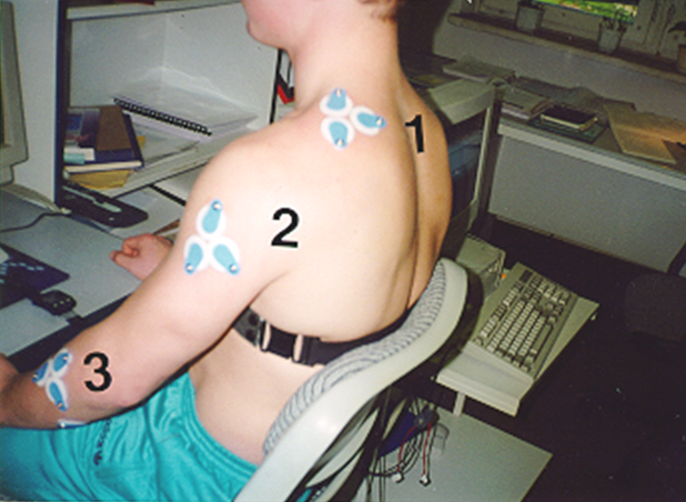 Szczególnie przydatnym narzędziem oceny obciążenia i zmęczenia układu mięśniowo-szkieletowego jest elektromiografia powierzchniowa. Ocena w tej metodzie przeprowadzana na bazie analizy elektromiogramu (EMG), rejestrowanego z wybranych mięśni, zaangażowanych w wykonywanie czynności pracy. Metoda ta stosowana jest szczególnie w przypadku pomiarów sygnału z mięśni znajdujących się tuż pod skórą oraz mięśni stosunkowo dużych, umożliwiających łatwe umieszczenie elektrod badawczych (rys. 1). Przyjmuje się, że wysiłek mięśniowy jest proporcjonalny do napięcia mięśni, na co wskazuje zależność pomiędzy siłą mięśniową a wartością odpowiednio przetworzonej amplitudy sygnału EMG generowanego przez dany mięsień.