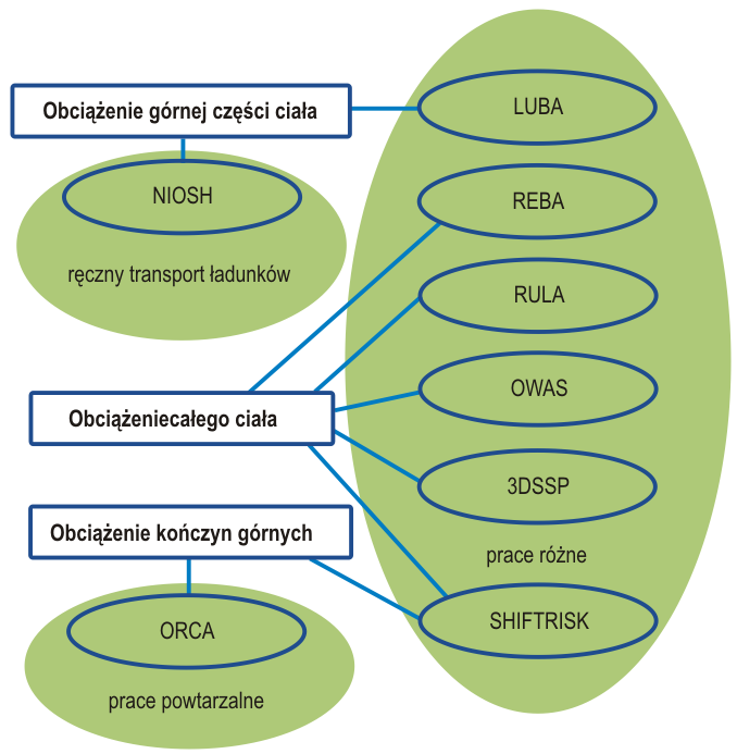 Metody oceny obciążenia zewnętrznego różnią się między sobą sposobem postępowania podczas identyfikacji parametrów opisujących wykonywaną pracę, a także sposobem oceny obciążenia i w pewnych przypadkach wyznaczania wielkości ryzyka związanego z tym obciążeniem. Metody oceny obciążenia zewnętrznego można pogrupować ze względu na różne ich cechy charakterystyczne; metody różnią się ze względu na obszar ciała podlegający ocenie, rodzaj czynności pracy objętych metodą, dokładność danych wejściowych i procedurę oceny obciążenia (rys.3).