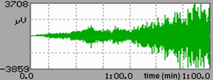 Sygnał EMG jest źródłem wielu informacji dotyczących procesów zachodzących w mięśniu, w tym obciążenia i zmęczenia mięśnia. Jednakże nieprzetworzony sygnał EMG niesie ze sobą tylko informację jakościową, za pomocą której można stwierdzić, czy mięsień jest aktywny i czy generuje siłę. Na rys. 2 przedstawiono przebieg nieprzetworzonego sygnału EMG zarejestrowanego w ciągu 1 minuty. Widoczny jest wyraźny wzrost amplitudy sygnału wynikający ze wzrostu siły mięśnia. Na podstawie zapisu nieprzetworzonego sygnału EMG, możliwa jest jedynie ocena jakościowa wskazująca, czy mięsień pracuje z większą czy mniejszą siłą. Aby uzyskać informację ilościową należy dokonać obróbki matematycznej sygnału. Na jej podstawie można wyodrębnić parametry charakteryzujące sygnał EMG, które wskazują na procesy zachodzące w mięśniu.
