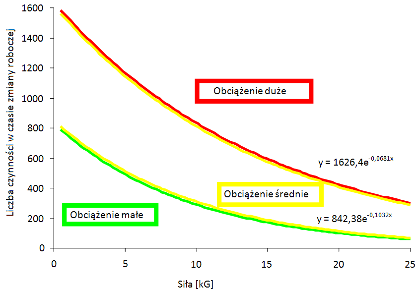 Rys. 1. Zależność między liczbą cykli w ciągu zmiany roboczej (oś Y) i siłą zewnętrzną.