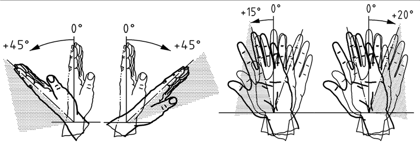 Rys. 3. Położenie i ruch w nadgarstku a) zginanie/prostowanie; b) odwodzenie/przywodzenie (PN-EN-1005-5).
