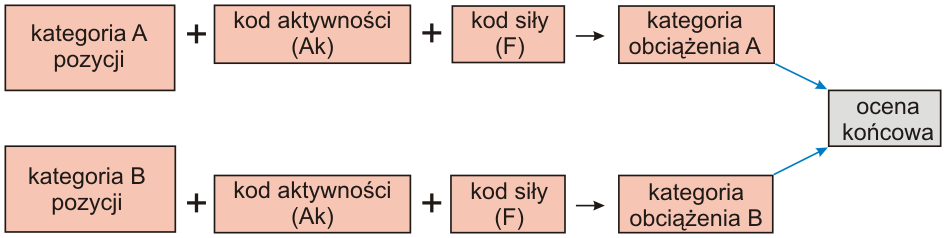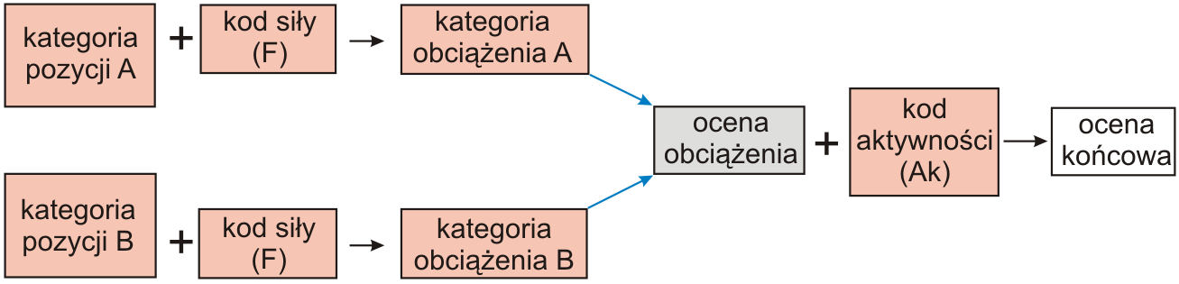 W celu uwzględnienia dodatkowego obciążenia wynikającego z pracy statycznej lub pracy powtarzalnej bądź też obciążenia związanego z wywieraniem siły zewnętrznej konieczne są dalsze kroki oceny. Ocena dotyczy zarówno grupy A jak i grupy B (Rys. 6).