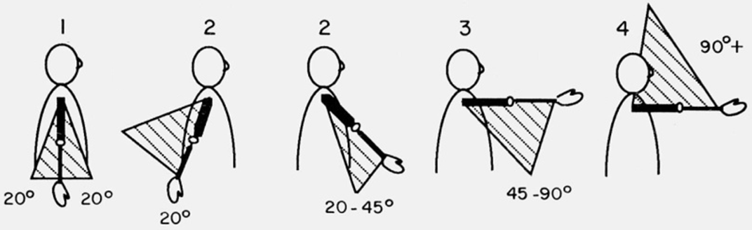 Rys. 1. Kody nadawane poszczególnym położeniom ramienia w metodzie RULA (McAtamney i Corlett, 1993).
