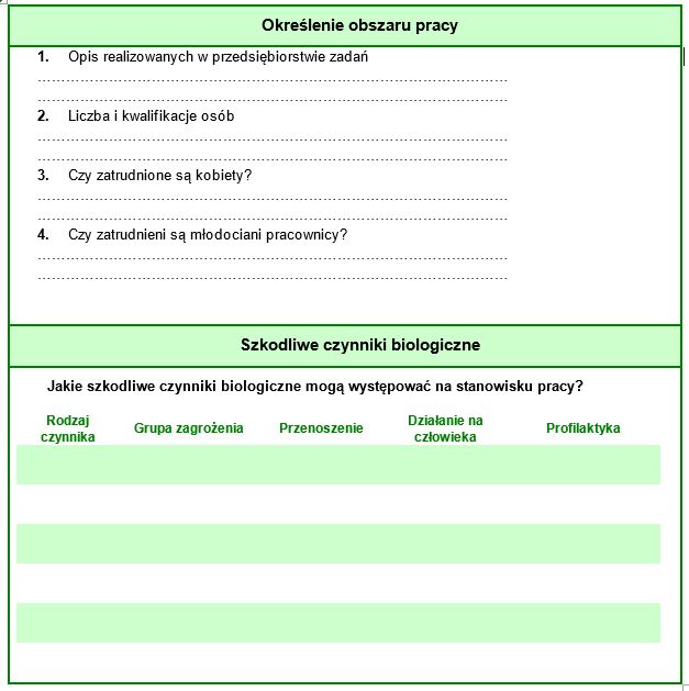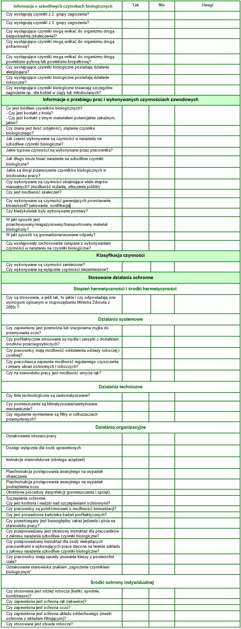 Lista kontrolna dotycząca narażenia na stanowiskach pracy zawiera zestaw pytań dotyczący, m.in. identyfikacji szkodliwych czynników biologicznych, organizacji profilaktyki i stosowania środków ochrony indywidualnej. Listy te mają charakter otwarty, jako że zawsze powinny być dostosowane do konkretnej sytuacji przez osobę oceniającą ryzyko.