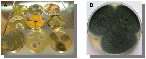 A - kolonie różnych gatunków grzybów, B - kolonie Aspergillus fumigatus.