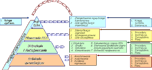 Kolejnymi, schodząc w dół, poziomami tej hierarchicznej struktury PZA i SZB są planowanie PZA, wdrażanie i funkcjonowanie oraz działania sprawdzające. Wszystkie poziomy PZA są koordynowane, sprawdzane, inicjowane przez prowadzącego zakład. Nadzór nad wdrażaniem i realizacją PZA i SZB wykonuje prowadzący zakład. Narzędziem służącym do realizacji wymienionych działań przez prowadzącego zakład jest przegląd kierownictwa, dokonywany w określonych odstępach czasu przez prowadzącego zakład wraz z zespołem przez niego wyznaczonym.