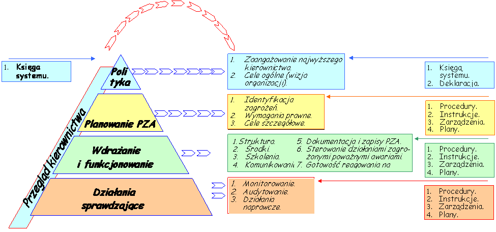 Zgodnie z wcześniejszym uzasadnieniem, a w szczególności uwzględniając interpretację wymagań Dyrektywy Seveso II, zawartą w dokumencie „Wytyczne w sprawie polityki zapobiegania awariom i systemu zarządzania bezpieczeństwem, zgodnie z wymogami Dyrektywy Rady 96/82/WE (Seveso II)” proponujemy hierarchiczny układ dokumentacji związanej z PZA i SZB. Punktem wyjścia do tworzenia i realizacji PZA i SZB jest polityka (wierzchołek trójkąta – zob. rysunek). Polityka powinna stanowić podstawę ustalania celów ogólnych oraz szczegółowych oraz deklarować metody realizacji tychże celów uwzględniając uwarunkowania techniczne i społeczne na obszarze działania ZZR lub ZDR.