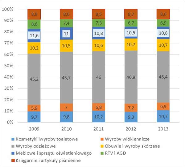Udział sklepów z artykułami nieżywnościowym i w strukturze sklepów w Polsce jest dość stabilny i oscyluje w ostatnich latach w granicach 21-21,6%. Struktura branżowa tych sklepów także nie wykazuje istotnych zmian (rys.2). Największy udział mają sklepy odzieżowe (45,4% w 2013 r, wobec 45,2% w 2009 r.). Zmniejsza się natomiast nieznacznie udział sklepów z RTV oraz AGD, a także sklepów z meblami i oświetleniem, które mają silną konkurencję w postaci sieci wielko powierzchniowych obiektów handlowych, z szerokim asortymentem tych produktów oferowanych po niskich cenach.