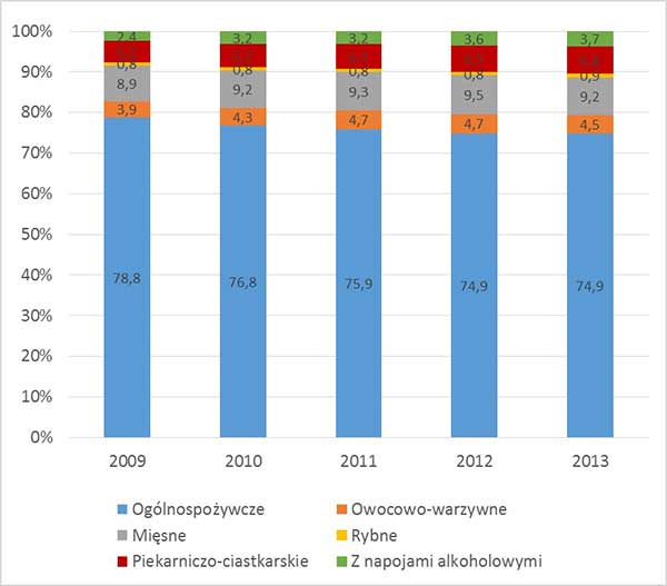 W 2013 r. w porównaniu z 2012 r. zwiększyła się liczebność sklepów rybnych oraz piekarniczo-ciastkarskich, jednak wciąż największy udział w strukturze sklepów z artykułami żywnościowymi mają sklepy mięsne (9,2%) i piekrniczo-ciastkarskie (6,8%), których udziały w strukturze sklepów z artykułami żywnościowymi wzrosły w porównaniu z 2009 r.
