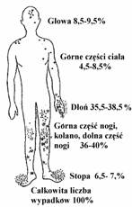 Rysunek. 8. Najczęstsze umiejscowienie urazów doznanych podczas użytkowania przenośnych pilarek łańcuchowych do drewna