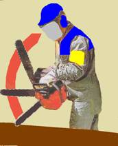 Rysunek 13. Właściwe ustawienie się poza linią cięcia piły łańcuchowej pilarki podczas przecinania elementów drewnianych.