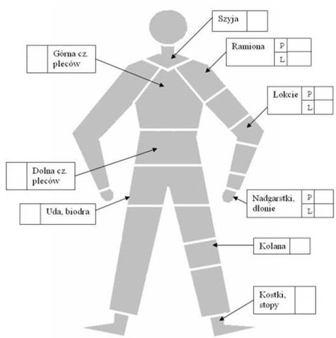 W dalszej części pytania dotyczą dolegliwości mięśniowo-szkieletowych, które są miarą i skutkiem obciążenia fizycznego. Pytania te zostały przedstawione graficznie w formie schematu człowieka z zaznaczonymi poszczególnymi częściami ciała, na którym respondent ma wskazać bolące miejsca. Odczuwane problemy mięśniowo-szkieletowe określane są w okresie ostatniego tygodnia i roku. Rolnik zapytany jest także o bóle mięśniowo-szkieletowe odczuwane w ciągu ostatniego roku, które uniemożliwiały wykonywanie typowejpracy.