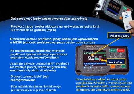 - Ostrzega kierowcę wózka o przekroczeniu ustalonej wartości maksymalnej prędkości; zlekceważenie ostrzeżenia przez kierowcę powoduje włączenie się alarmu dźwiękowego i zarejestrowanie zdarzenia w rejestrze.