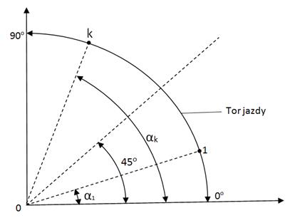 System zastosowany w wózku TRAIGO 24 zmniejsza prędkość jazdy w zależności od kąta skręcenia tylnego koła. Kąt α1 oznacza kąt, po przebyciu którego wózek zaczął zmniejszać prędkość. Kąt αk jest kątem, po przebyciu którego prędkość zmniejszyła się samoczynnie do wartości najmniejszej. Oszacowano, że w przypadku toru jazdy w postaci łuku o promieniu 3 m i 4 m, α1 wyniósł między 5 a 10 stopni, zaś αk – między 70 a 80 stopni. Wielkości te są szacunkowe i mogą być obarczone pewną niepewnością, ponieważ nie było możliwości dokładnego pomiaru tych kątów. W przypadku toru jazdy zbliżonego do toru o promieniu R=5 m kątów tych nie szacowano. W tablicy 3.1 zawarto zarejestrowane wartości prędkości V0 i Vk podczas jazdy po łuku o promieniu R wynoszącym 3 m, 4 m i 5 m.