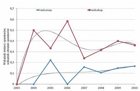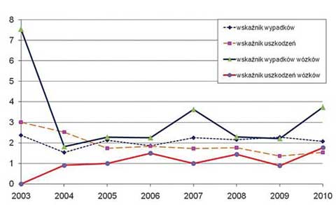 Zestawienie przebiegów wymienionych wskaźników wobec urządzeń transportu bliskiego, z wyszczególnieniem wózków jezdniowych, w latach 2003- 2010 przedstawiono na rys. 1.