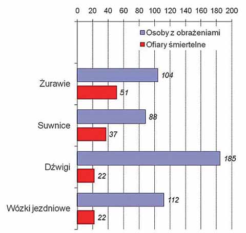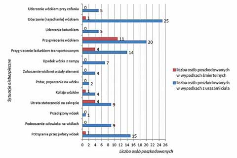Skutki niebezpiecznych zdarzeń wyrażone w liczbie ofiar śmiertelnych i osób z obrażeniami ciała dają obraz niebezpieczeństwa pracy maszyn. Na rys. 2. zamieszczono wykaz liczbowy skutków wypadków przy pracy z wykorzystaniem wózków jezdniowych podnośnikowych w zestawieniu z podstawowymi dźwignicami. Mimo, że dane dotyczące wózków jezdniowych dotyczą okresu o 2 lata krótszego niż odnoszące się do podstawowych dźwignic, to jednak liczba ofiar śmiertelnych na wózkach i dźwigach jest taka sama. Niebezpieczne zdarzenia przy pracy wózków jezdniowych prowadzą do znaczącej liczby osób poszkodowanych, co wymaga dalszej analizy szczegółowej przyczyn i skutków tych zdarzeń.