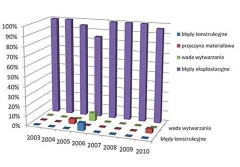 Najczęstszą przyczyną wypadków przy pracy omawianych wózków były błędy eksploatacyjne, a następnie błędy konstrukcyjne i wady wytwarzania.