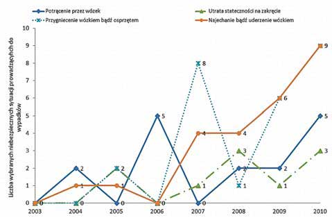 Rys. 4. Wybrane niebezpieczne sytuacje prowadzące do wypadków w latach 2003^2010 ( - Potrącenie przez wózek, - Przygniecenie wózkiem bądź osprzętem, - Utrata stateczności na zakręcie, - Najechanie bądź uderzenie wózkiem)