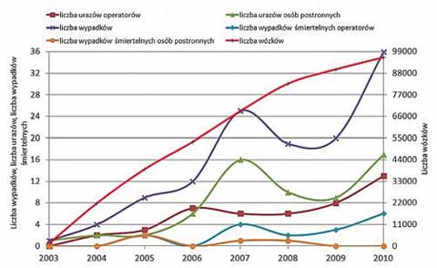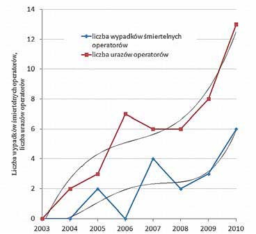 Liczby wypadków śmiertelnych i wypadków z urazami ciała wśród operatorów oraz osób postronnych przedstawiono na rys. 7. Widać na nim wzrost liczby obrażeń ciała, jak i wypadków śmiertelnych operatorów, niewielki wzrost obrażeń ciała operatorów i zdecydowane zmniejszenie liczby śmiertelnych zdarzeń z udziałem osób postronnych.