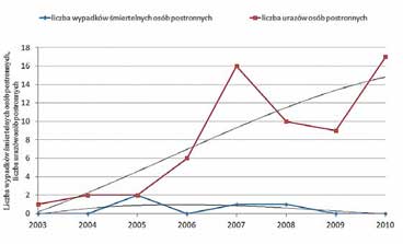 Rys. 7b. Liczba wypadków śmiertelnych oraz skutkujących urazami ciała w rozpatrywanym okresie: b) wśród osób postronnych