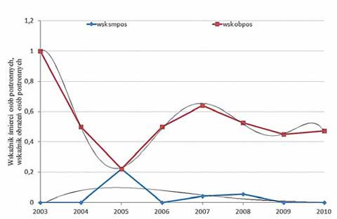 Rys. 1. Przebiegi wskaźników wypadków i uszkodzeń urządzeń transportu bliskiego