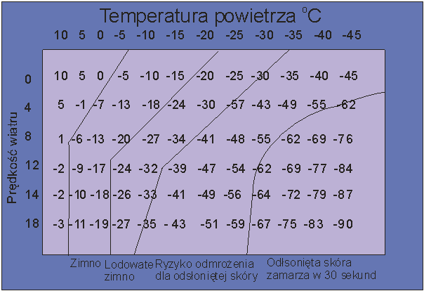 Kolejnym zagrożeniem jest niska temperatura. Dłuższe przebywanie w temperaturze już kilka stopni poniżej zera może skończyć się odmrożeniami. Nie wolno przeceniać własnej odporności - należy zawsze ubierać się w odzież ciepłochronną, chroniącą przed wiatrem i wodą - patrz rozdział poświęcony odzieży. Należy również pamiętać, że wilgoć i wiatr znacznie przyspieszają proces wychładzania.