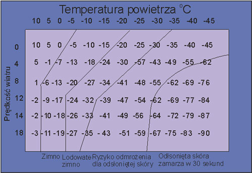 Właściwości termoizolacyjne odzieży charakteryzowane są przez jej izolacyjność cieplną, podaną w jednostkach m2*K/W. W zależności od wartości izolacyjności cieplnej oraz wydatku energetycznego jej użytkownika, odzież może być stosowana w określonym przedziale temperatur powietrza. Dodatkowo, w przypadku narażenia na wiatr, oceniając odczuwalną temperaturę, należy uwzględnić wskaźnik chłodzenia wiatrem (wind chill index - WCI). W tabeli 3 podano zmiany temperatury odczuwalnej, po uwzględnieniu czynnika chłodzenia wiatrem.