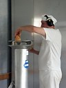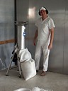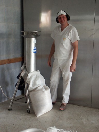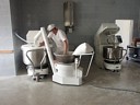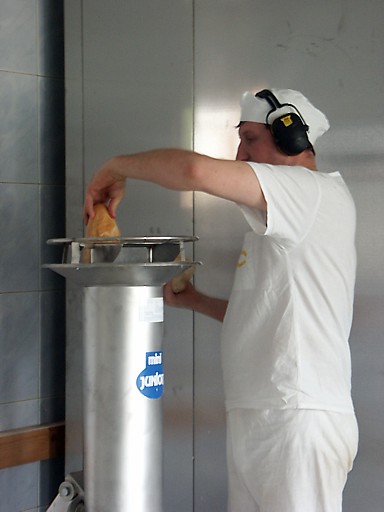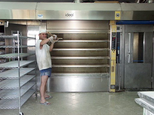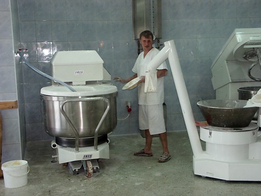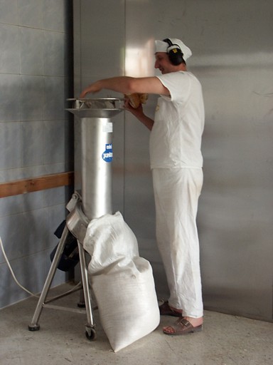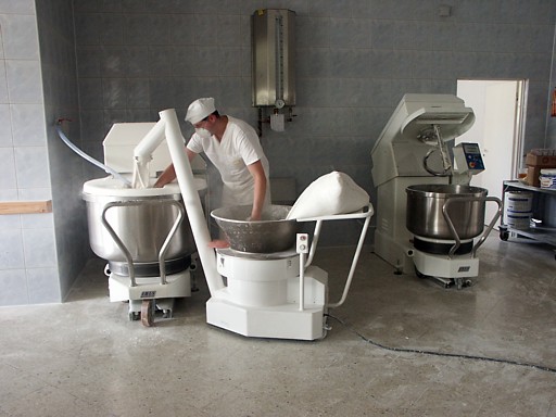 | Ciastownia - do typowych zagrożeń można zaliczyć obsługę niebezpiecznych maszyn (zagrożenie pochwyceniem i zgnieceniem lub przecięciem przez poruszające się elementy maszyn, poślizgnięcie się i upadek, spadające przedmioty lub przetaczane dzieże mogące spowodować urazy stóp. Pyły mąki szczególnie podczas ich przesypywania przez sita. Hala wypiekowa - do typowych zagrożeń można zaliczyć: kontakt z gorącymi powierzchniami pieca oraz wyrobów, zagrożenie poparzeniem parą wodną, promieniowanie podczerwone, niedostateczne oświetlenie, poślizgnięcie i upadek na śliskiej powierzchni. Magazyn - Transport przedmiotów, worków z mąką, znaczne zapylenie. Ekspedycja pieczywa - śliskie powierzchnie powodujące ryzko upadku, transportowane pojemniki na chleb Pomieszczenie do trzepania worków - W pomieszczeniach, w których odbywa się trzepanie worków powinny być zainstalowane urządzenia do odprowadzania pyłów. Zabrania się trzepania worków w pomieszczeniach produkcyjnych, magazynach surowców, półfabrykatów i wyrobów gotowych. Transport - Większość piekarni dysponuje własnymi samochodami transportowymi. Dostawa pieczywa odbywa się do wielu sklepów i wiąże się z koniecznością rozładowywania samochodu dostawczego bezpośrednio na ulicy. Z tego względu istniej duże zagrożenie potrącenia pracownika przez poruszające się pojazdy. |