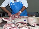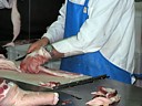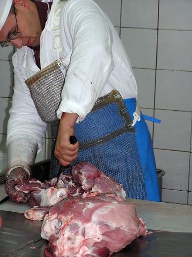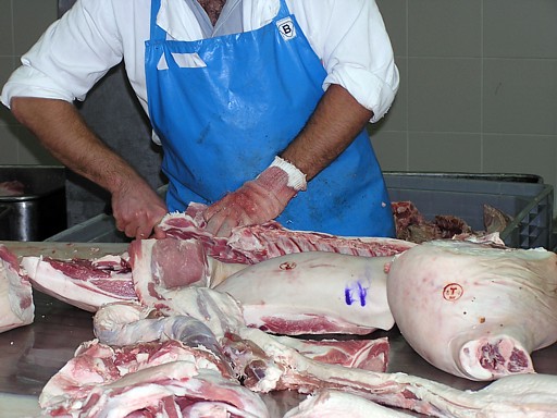 Podwieszone mechaniczne urządzenia do ręcznego przepoławiania tusz zwierząt rzeźnych (przecinarki) powinny być wyposażone w przeciwwagi oraz osłony do chroniące pracowników przed odpryskami kości i mięsa.