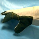 Ochrona rąk przed odpryskami stopionych metali - rękawice wykonane ze skór chromowych o wyprawie termoodpornej (skóry bydlęce i świńskie), podszewka impregnowana niepalnie. Rękawice spawalnicze powinny być szyte nićmi niepalnymi. Rękawice spawalnicze do spawania argonowego, przy którym wymagana jest szczególna zdolność manipulowania palcami rąk, wykonuje się z gładkiego lica koziego, końskiego lub świńskiego