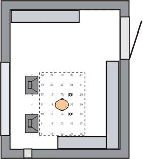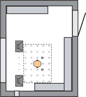 Rys. 7. Schemat rozmieszczenia źródeł wtórnych we wnętrzu kabiny dźwiękoizolacyjnej podczas badania układu do realizacji stref ciszy.