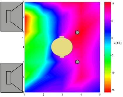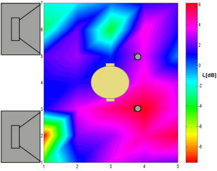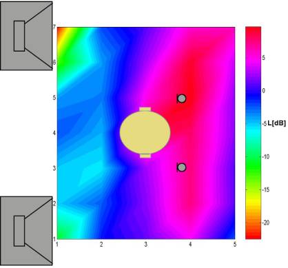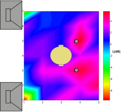 Rys. 10. Mapa rozkładu skuteczności aktywnej redukcji układu do realizacji stref ciszy dla sygnału hałasu w postaci tonu o częstotliwości 300Hz i odległości między źródłami wtórnymi wynoszącej 32cm.