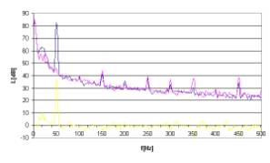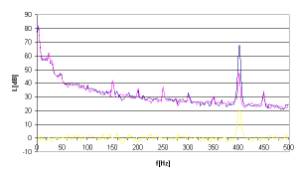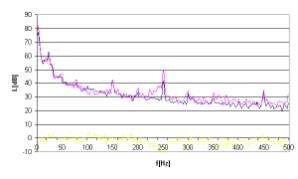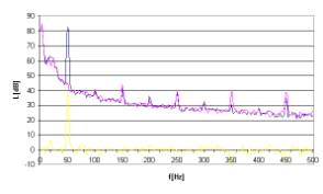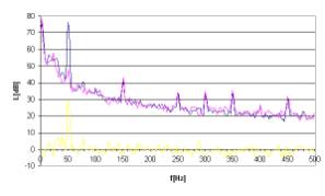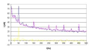 Rys. 12. Charakterystyki częstotliwościowe dla sygnału hałasu w postaci tonu o częstotliwości 50Hz.