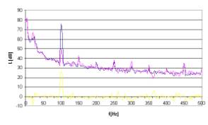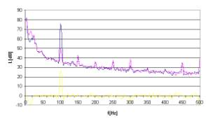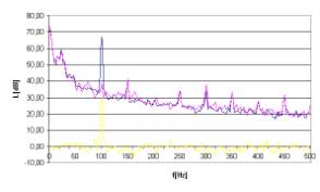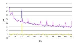 Rys. 13. Charakterystyki częstotliwościowe dla sygnału hałasu w postaci tonu o częstotliwości 100Hz.