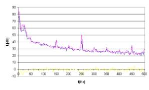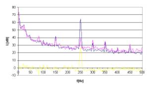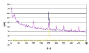 Rys. 15. Charakterystyki częstotliwościowe dla sygnału hałasu w postaci tonu o częstotliwości 250Hz.