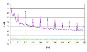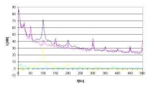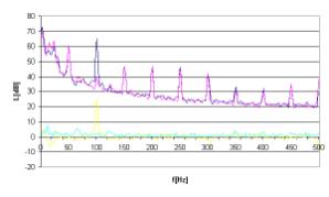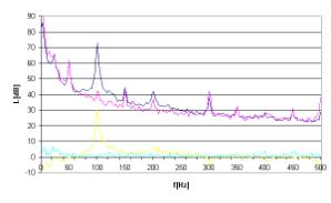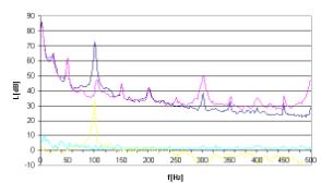 Rys 51. Charakterystyki częstotliwościowe dla sygnału hałasu w postaci tonu o częstotliwości 100Hz.