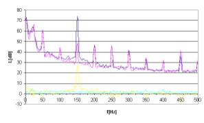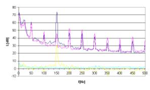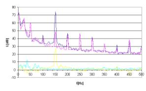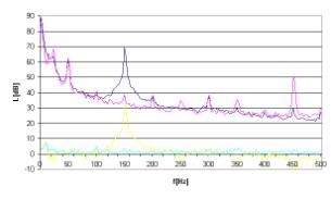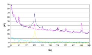 Rys 52. Charakterystyki częstotliwościowe dla sygnału hałasu w postaci tonu o częstotliwości 150Hz.