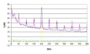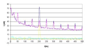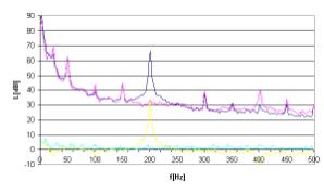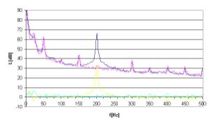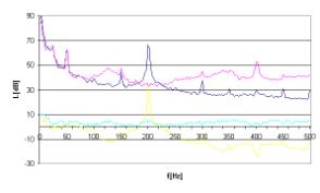 Rys 53. Charakterystyki częstotliwościowe dla sygnału hałasu w postaci tonu o częstotliwości 200Hz.