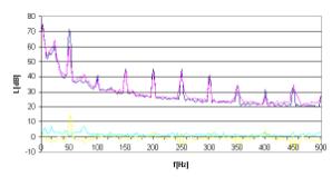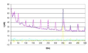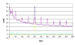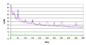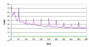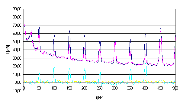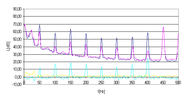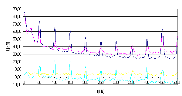 Rys 50. Charakterystyki częstotliwościowe dla sygnału hałasu w postaci tonu o częstotliwości 50Hz.