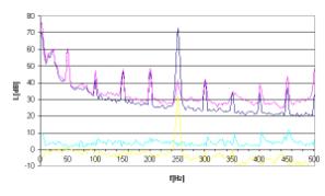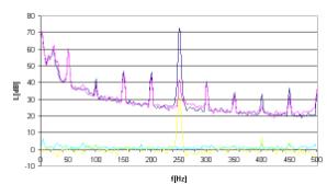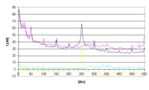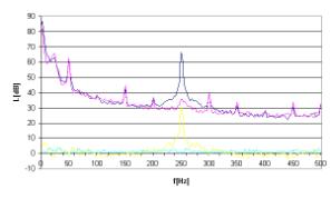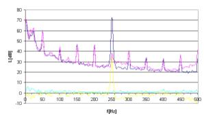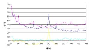 Rys 54. Charakterystyki częstotliwościowe dla sygnału hałasu w postaci tonu o częstotliwości 250Hz.