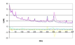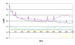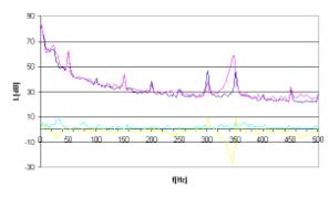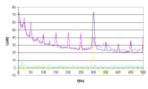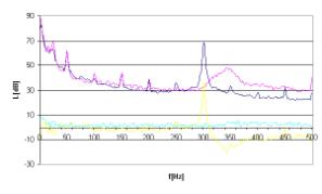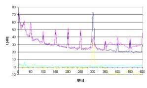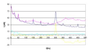 Rys 55. Charakterystyki częstotliwościowe dla sygnału hałasu w postaci tonu o częstotliwości 300Hz..