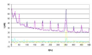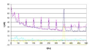 Rys 56. Charakterystyki częstotliwościowe dla sygnału hałasu w postaci tonu o częstotliwości 350Hz.
